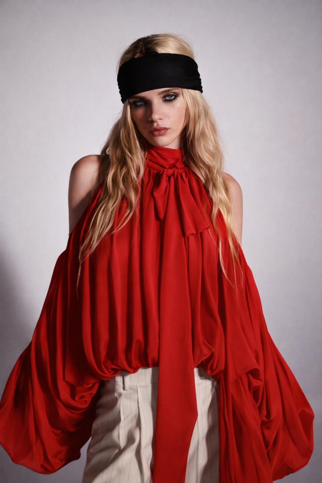 Blusa globo de manga larga Teodora con cuello halter y hombros descubiertos.