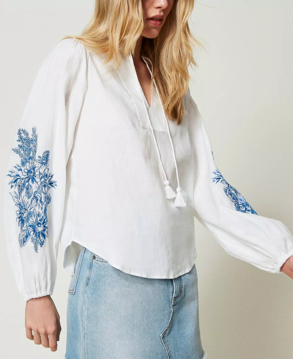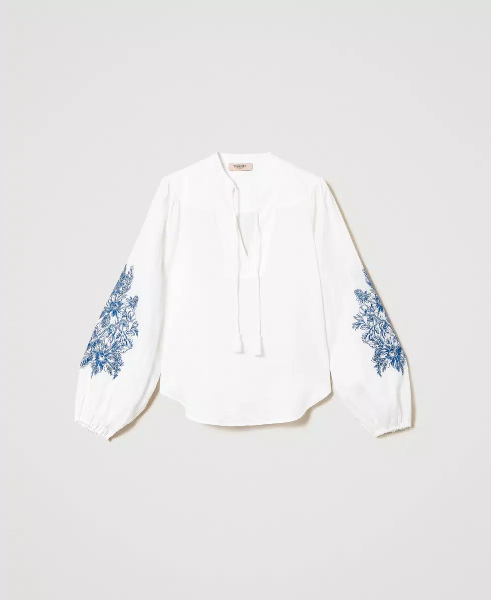 Fresco, refinado, contemporáneo. Renueva tu estilo con la blusa de tela de lino con bordado de hilos florales, un diseño exclusivo de Twinset. Tiene una línea ancha, cuello mao con abertura en V, remates de lazo y borla, mangas largas raglán con elástico forrado en los puños, canesú fruncido, dobladillo redondeado, placa con el logotipo Oval T en la espalda, sin forro. Será la pieza de culto de tus looks de temporada.