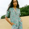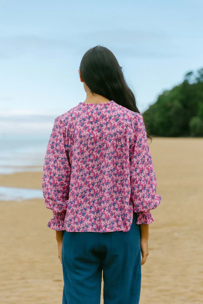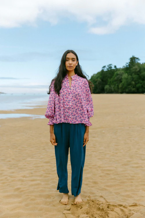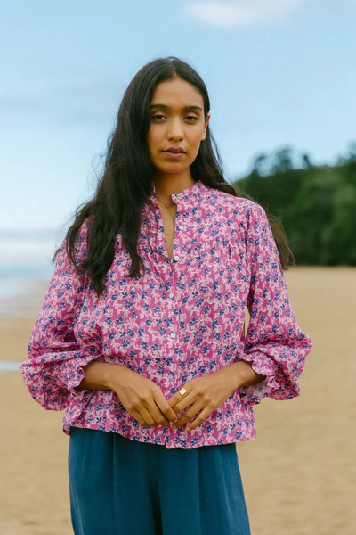 Blusa con botonadura de arriba a abajo, cuello a la caja y puño engomado.