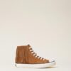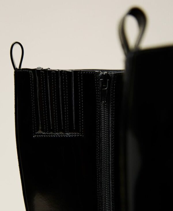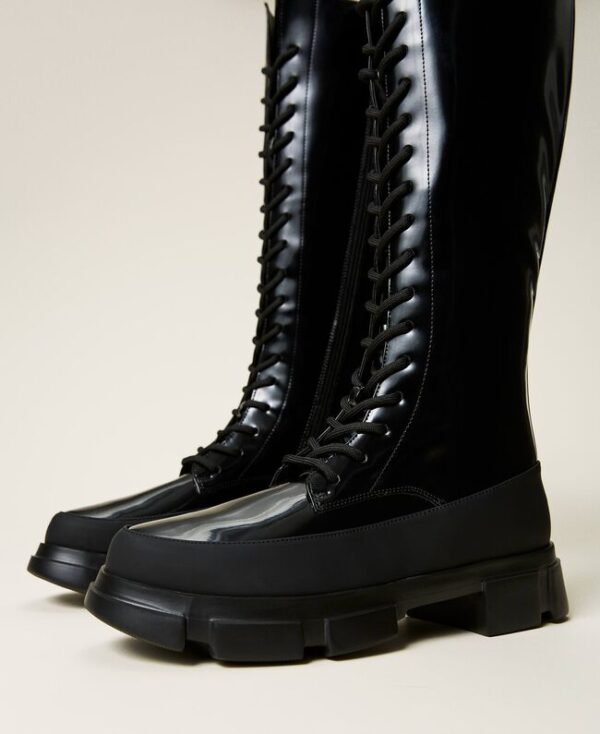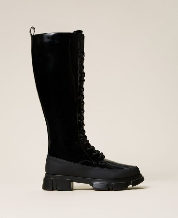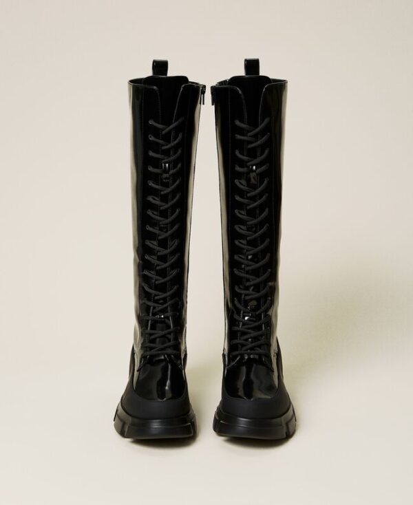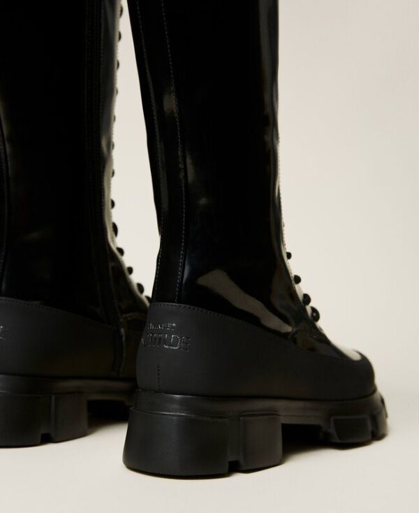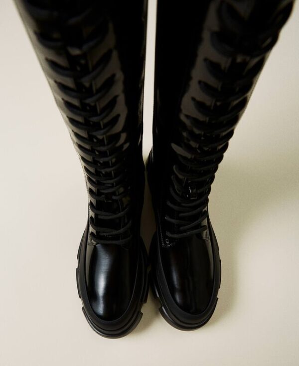 Botas militares altas de charol de tratamiento abrasivo con cordones en la parte central, cierre con cremallera interior y suela gruesa de goma.