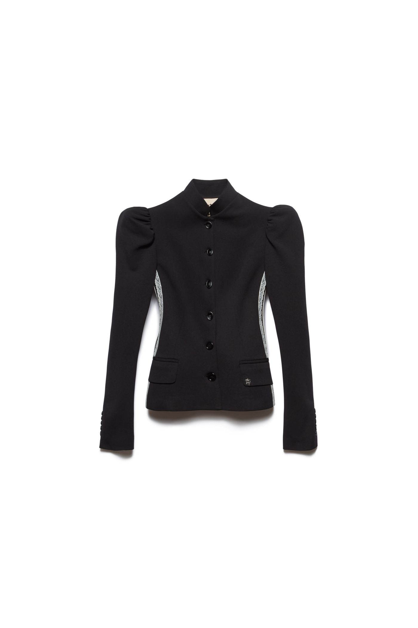 – Chaqueta entallada con cuello mandarín y hombros abullonados y cierre con botones de un solo pecho.