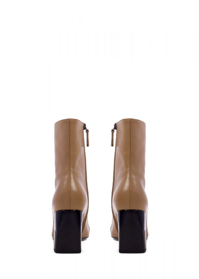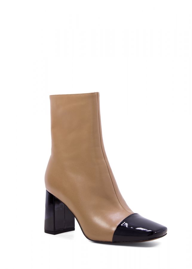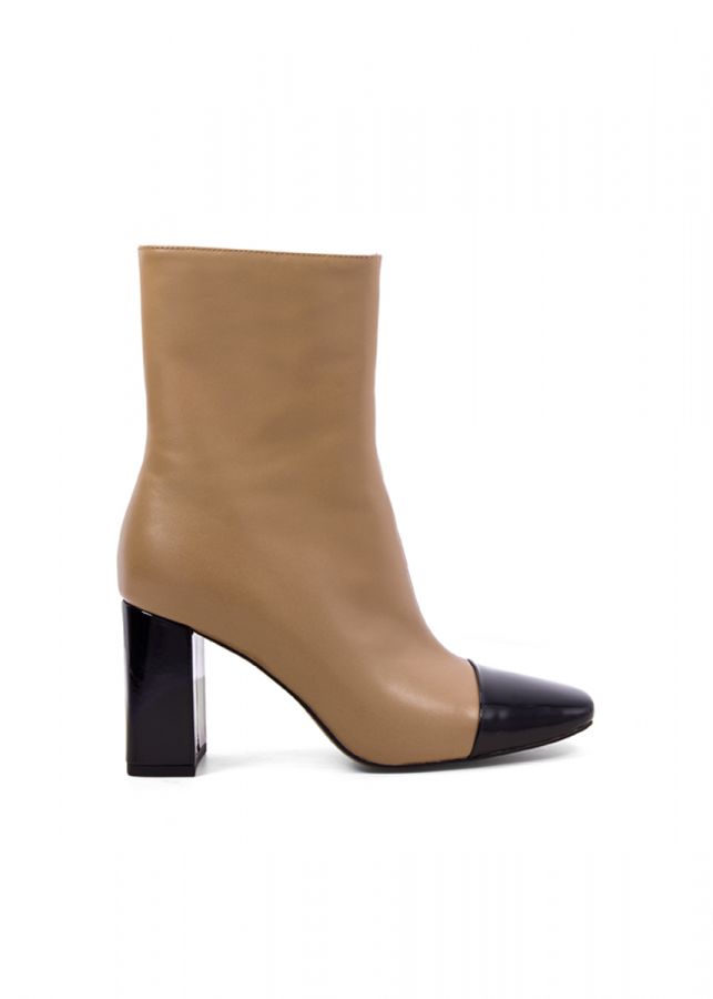 Botín en piel color camel con puntera color negro y tacón ancho altura aproximada 55mm