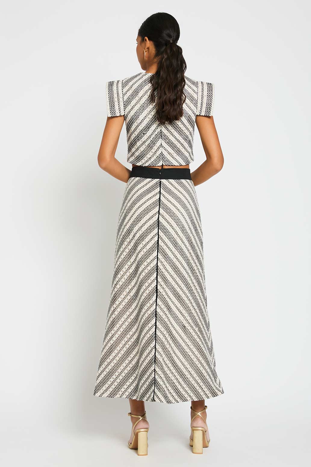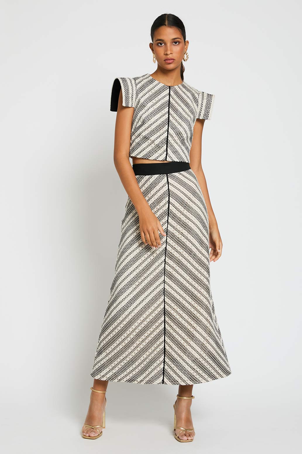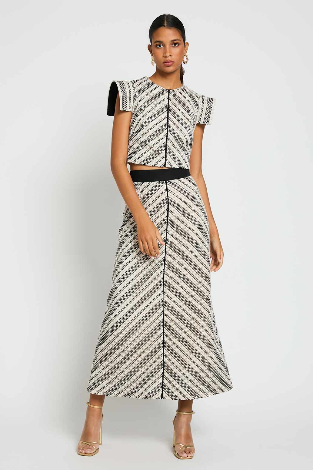 Falda guipur de maya trenzada. Falda midi en crepe de textura fluida, con corte recto y combinaciones de color en crudo y negro. Su silueta limpia y su tejido elegante la convierten en una pieza versátil para looks minimalistas con impacto. Ideal para celebraciones familiares, desde comuniones hasta comidas especiales. Diseñado y fabricado en España.