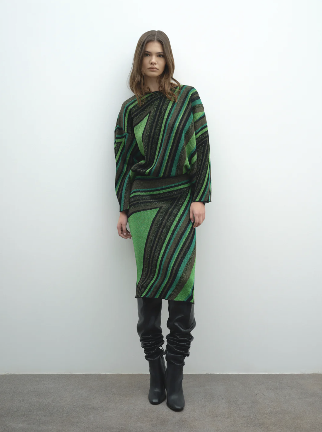 Falda longuette en tejido jacquard, con rayas diagonales multicolor que realzan la silueta y aportan movimiento.