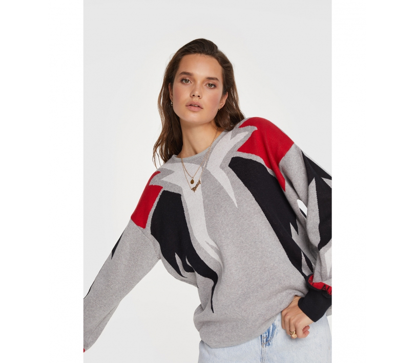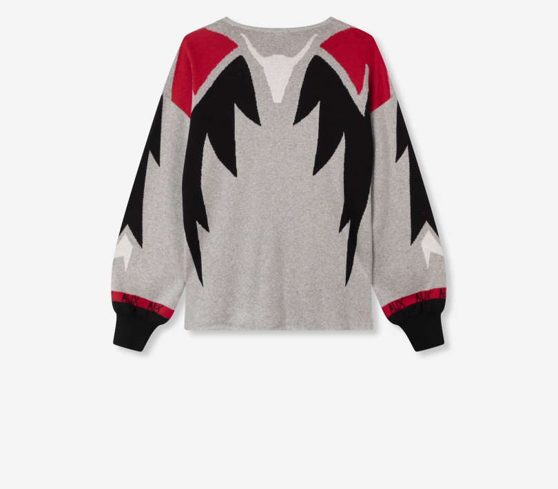 Jersey de punto jacquard. Diseñado con un estampado jacquard gráfico. Acabado con detalles de canalé en el cuello, los puños y el bajo.