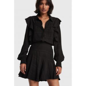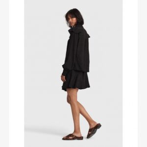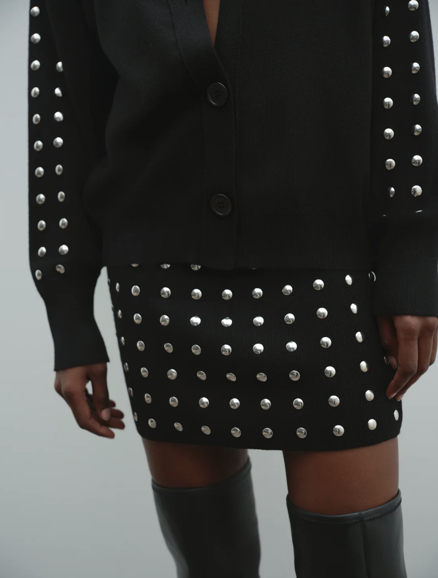 Minifalda de punto estructurado, de corte corto y lineal, adornada con tachuelas metálicas aplicadas en la parte frontal para un toque atrevido. Cierre lateral con cremallera oculta y ajuste regular. Una prenda versátil, perfecta para looks urbanos y de noche.
