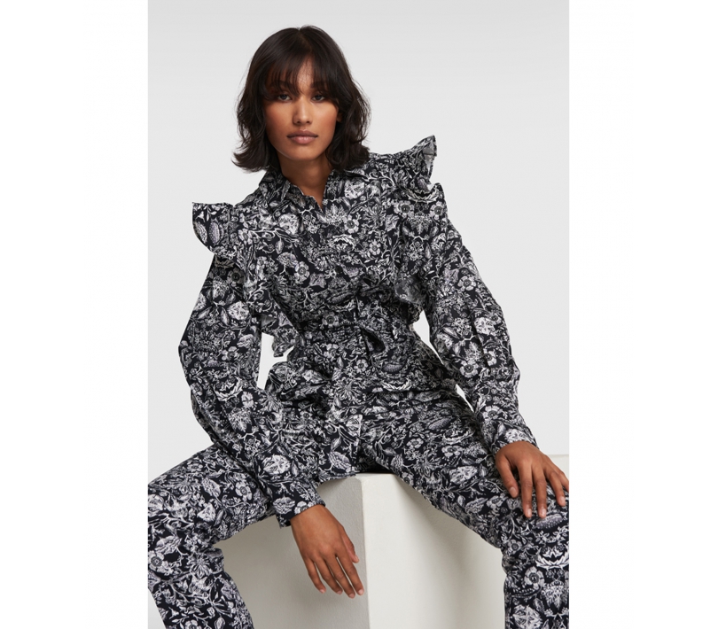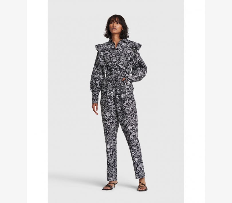 Corte de una tela de algodón con estampado de flores ornamentales en blanco y negro.