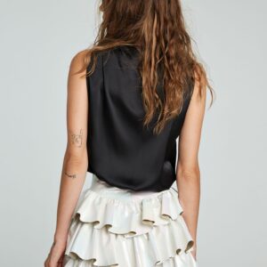 Con cuello clásico y cierre de botones en la parte delantera.
