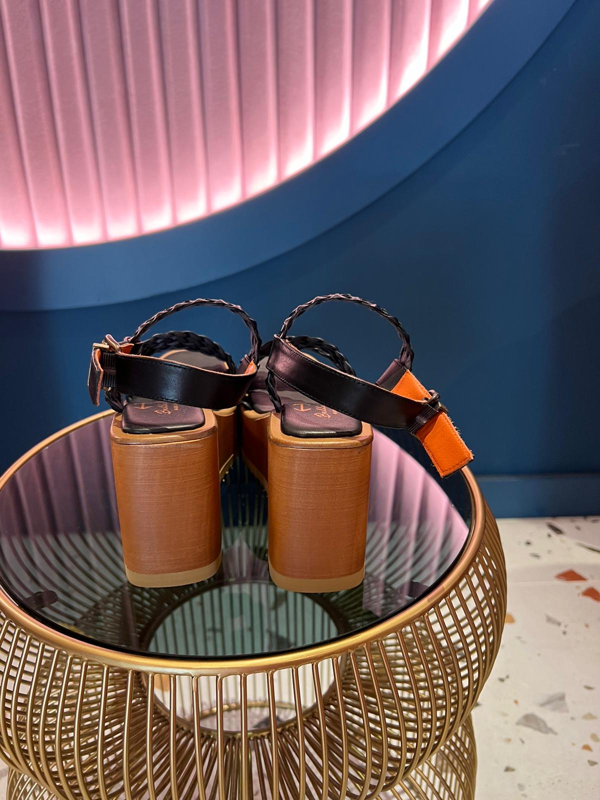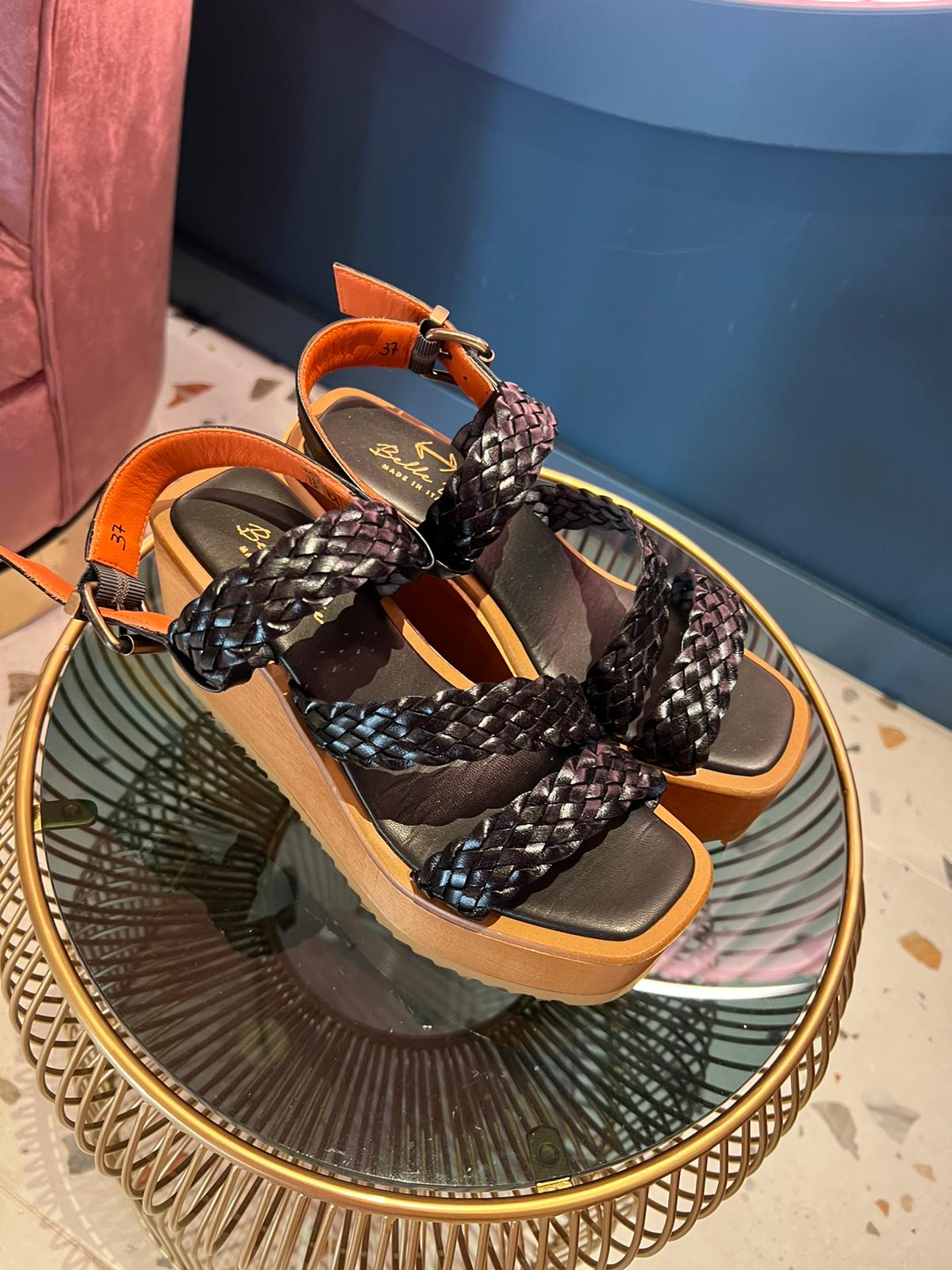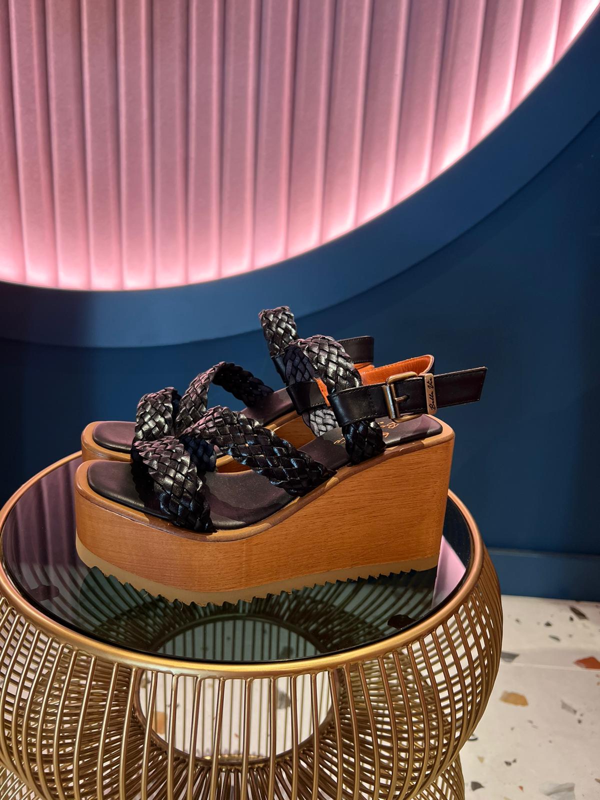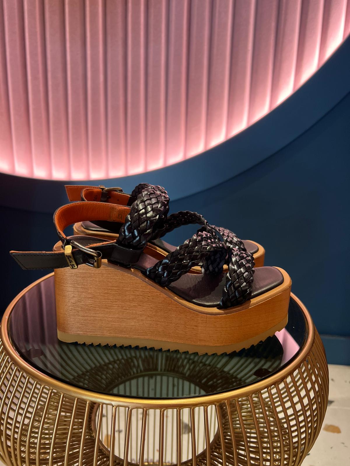 Sandalias de plataforma en color negro con la suela de madera y las cintas de piel trenzadas. Cuña del