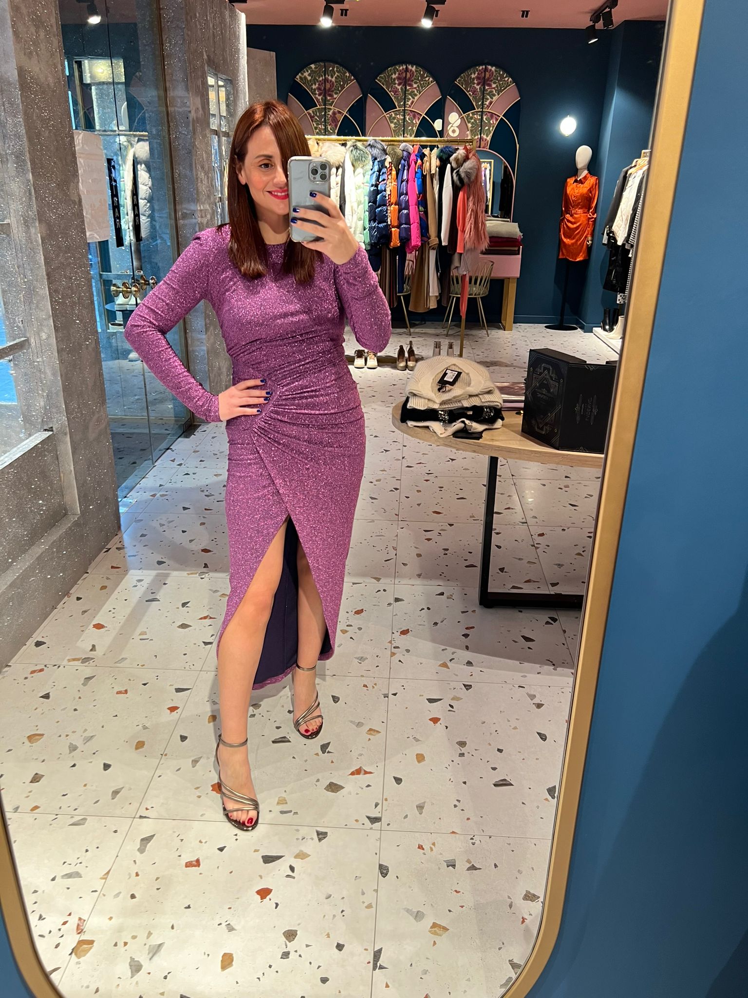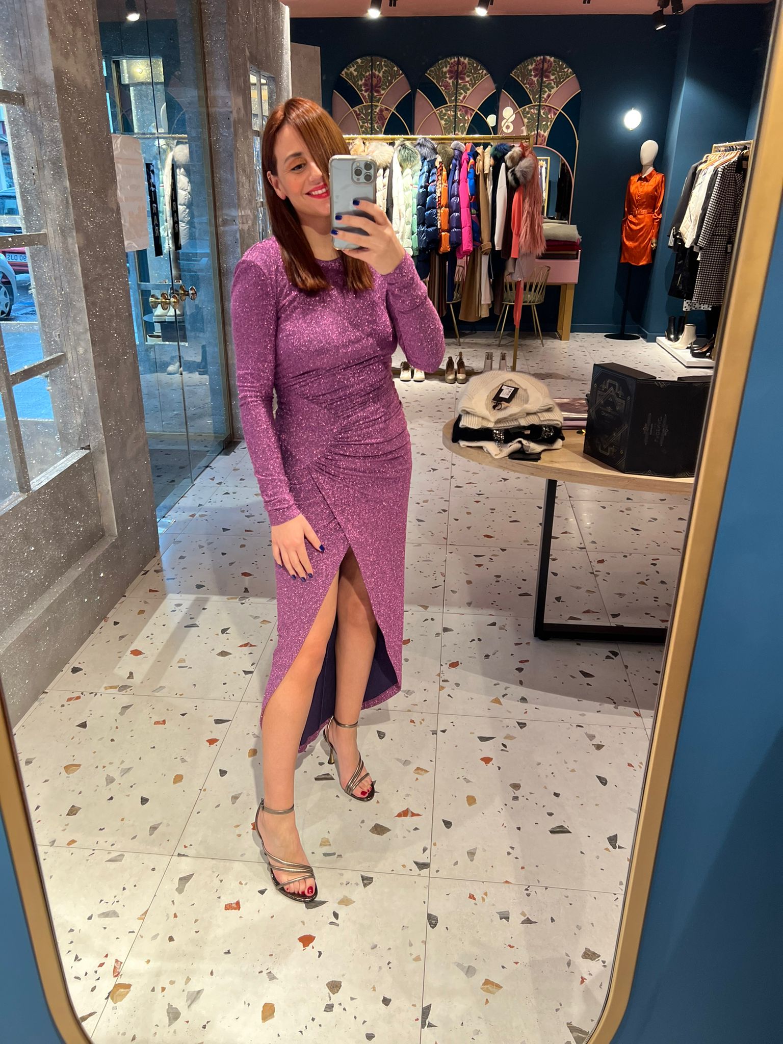 Vestido entallado en tejido de punto lurex con falda larga y abertura asimétrica