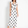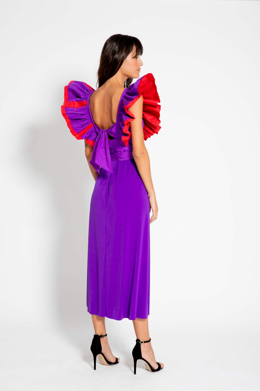Vestido de punto de manga corta. Maxi volantes. Escote cuadrado. Falda evasé. Diseño Exclusivo de Colour Nude. Hecho en España