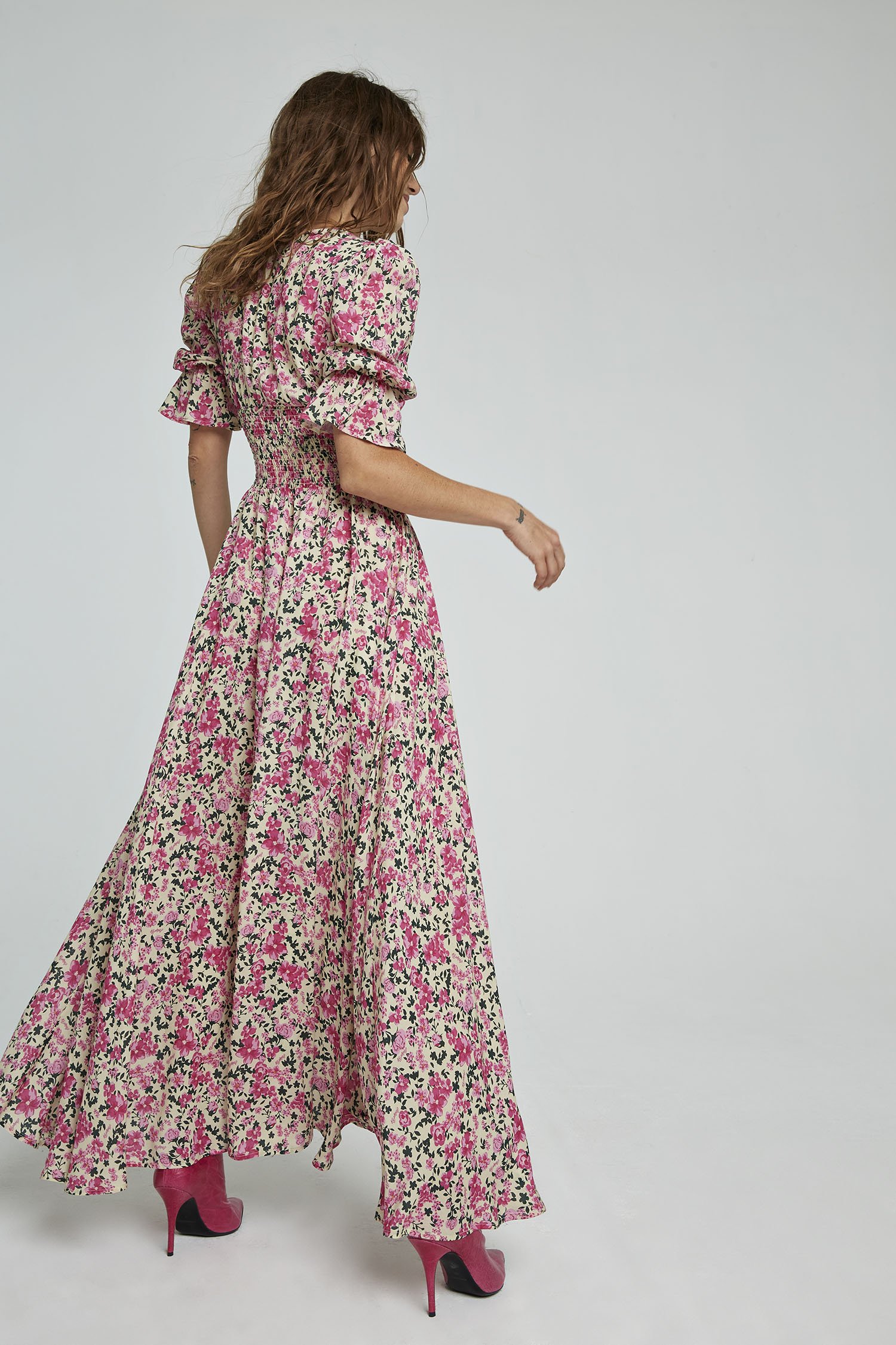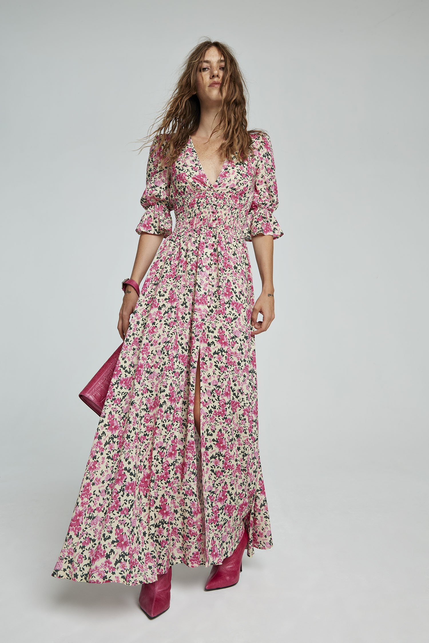 Vestido largo estampado floral con escote en pico y cintura elástica, con mangas a la altura de los codos y abertura delantera.