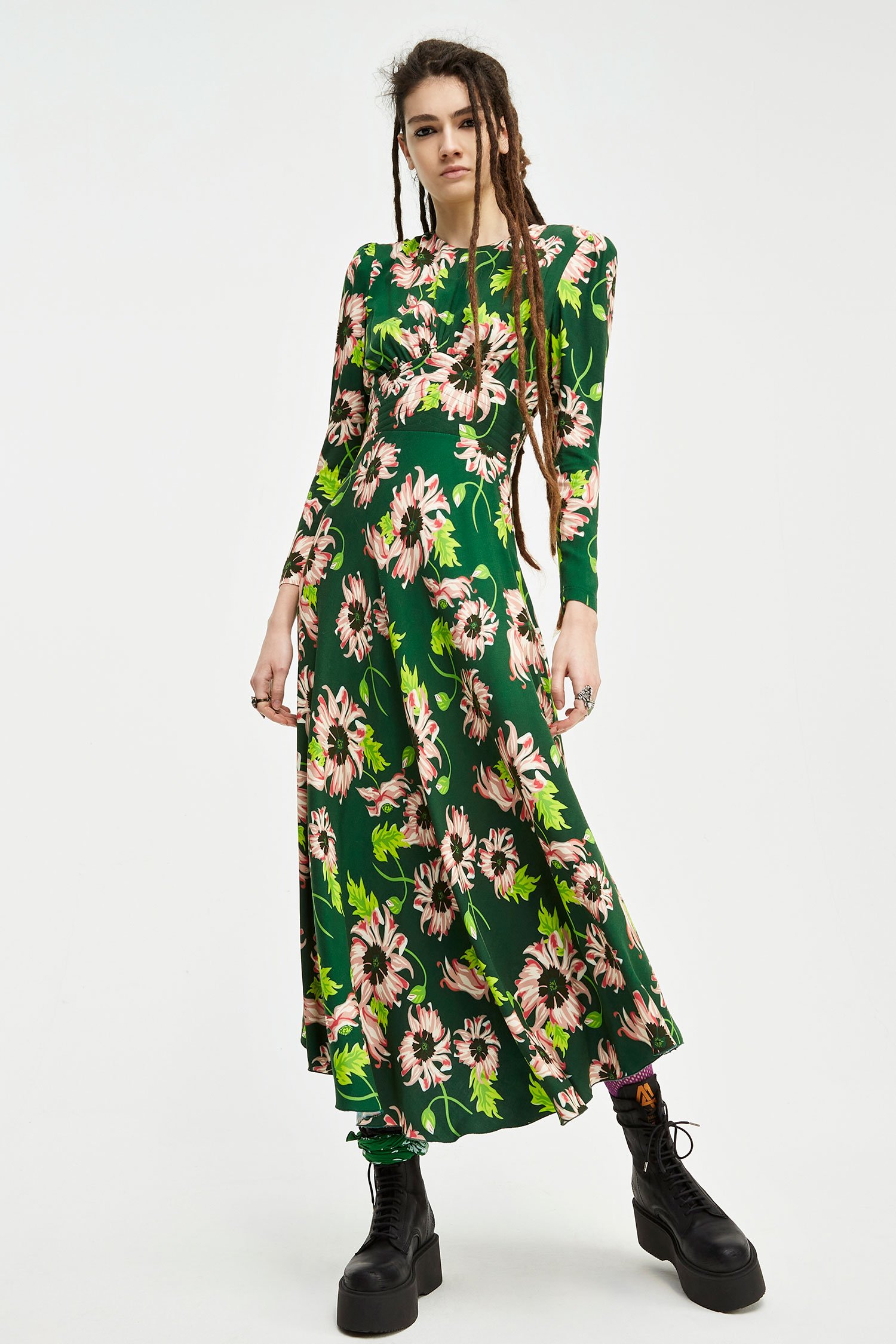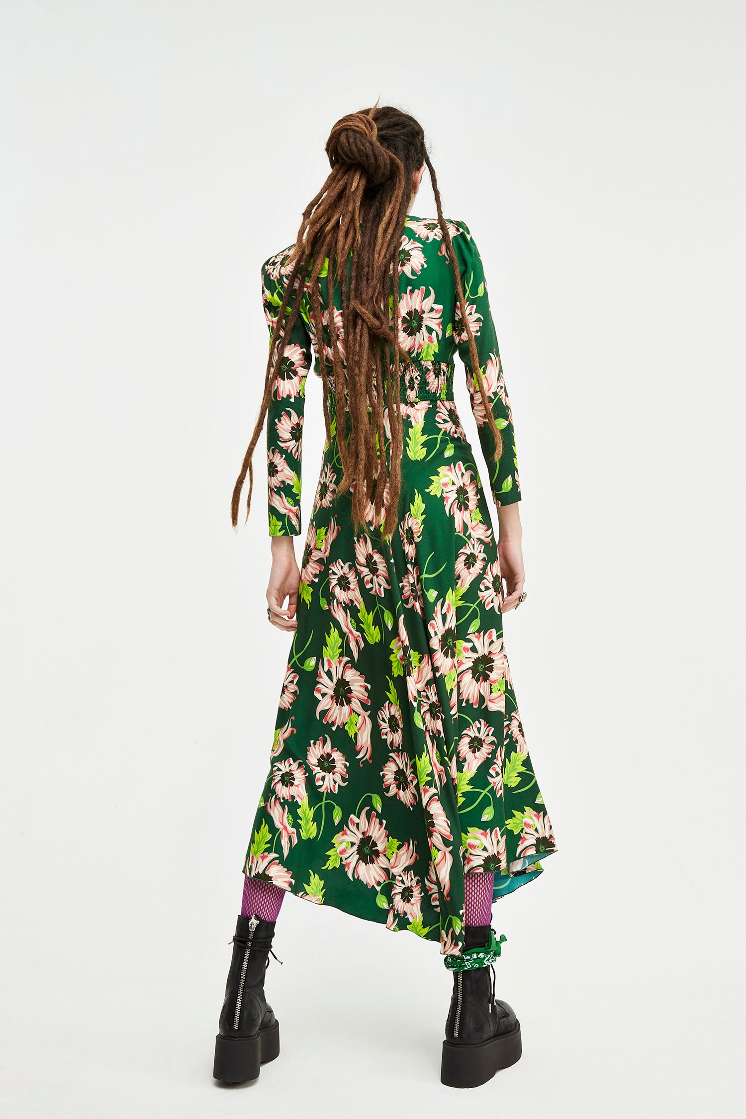 Vestido midi con estampado floral y goma cintura en la parte dela espalda. Lleva cremallera invisible en la parte lateral.