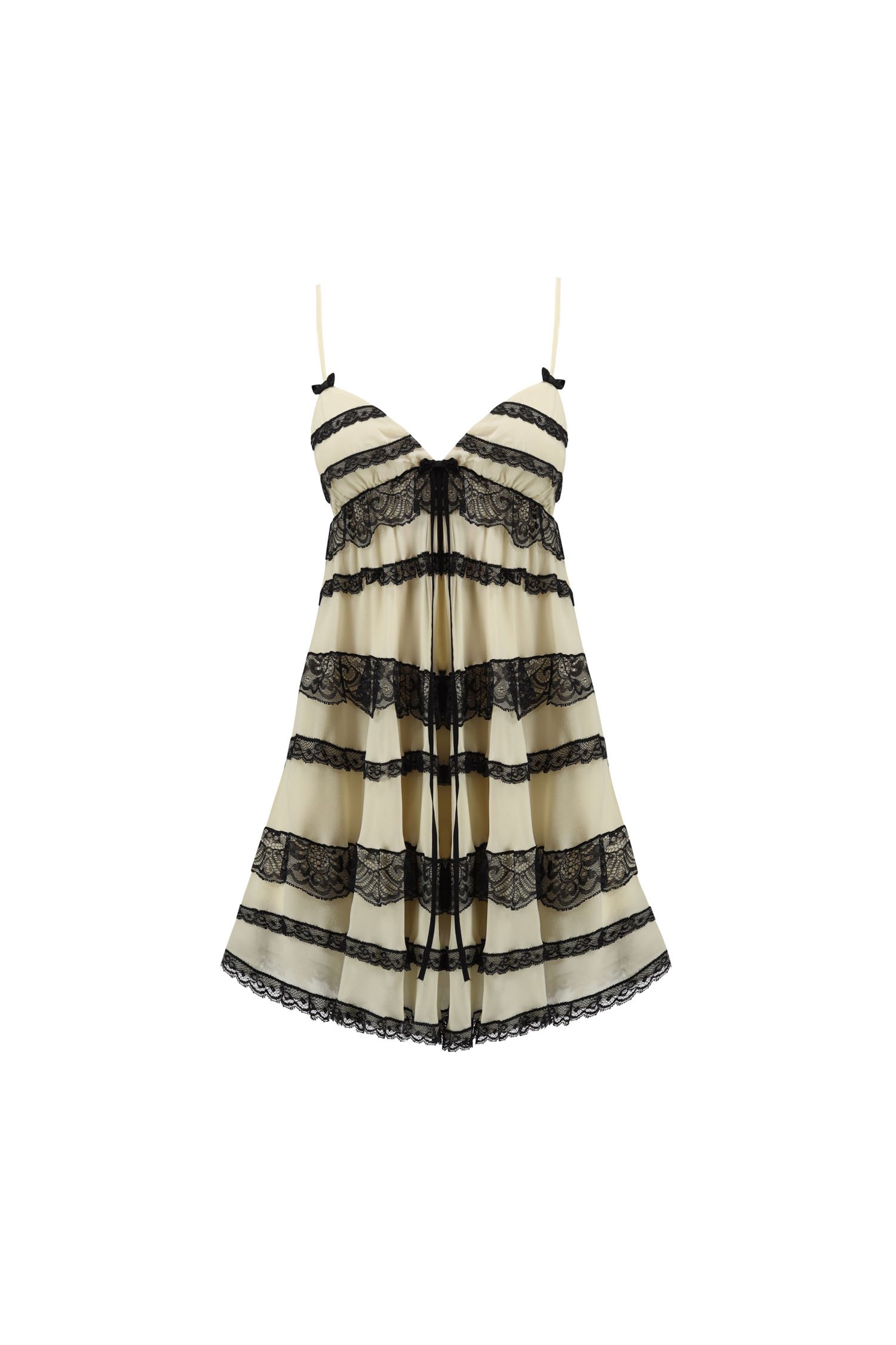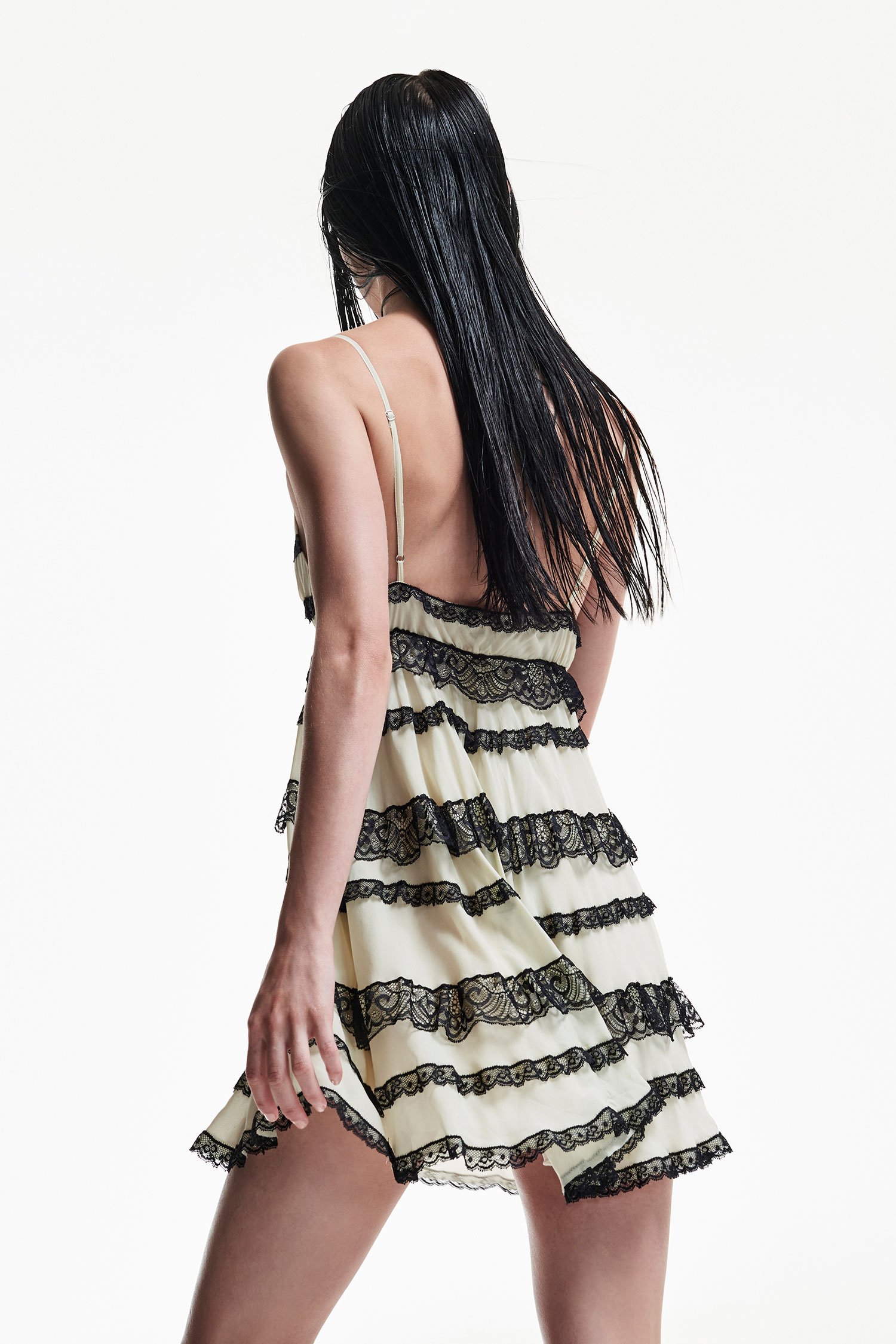 Vestido corto georgy de georgette de viscosa con volantes y tirantes finos. Detalles de encaje en contraste.