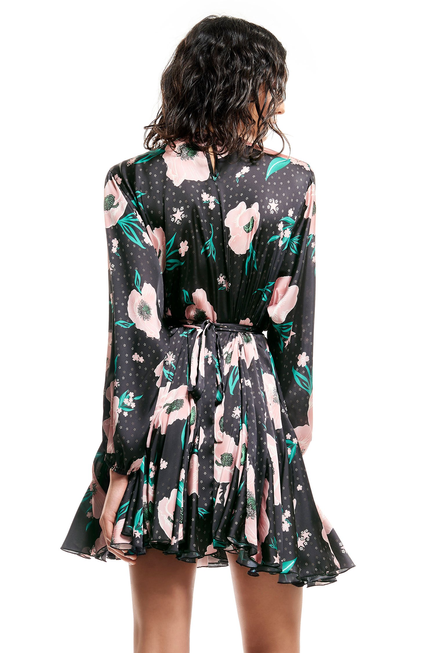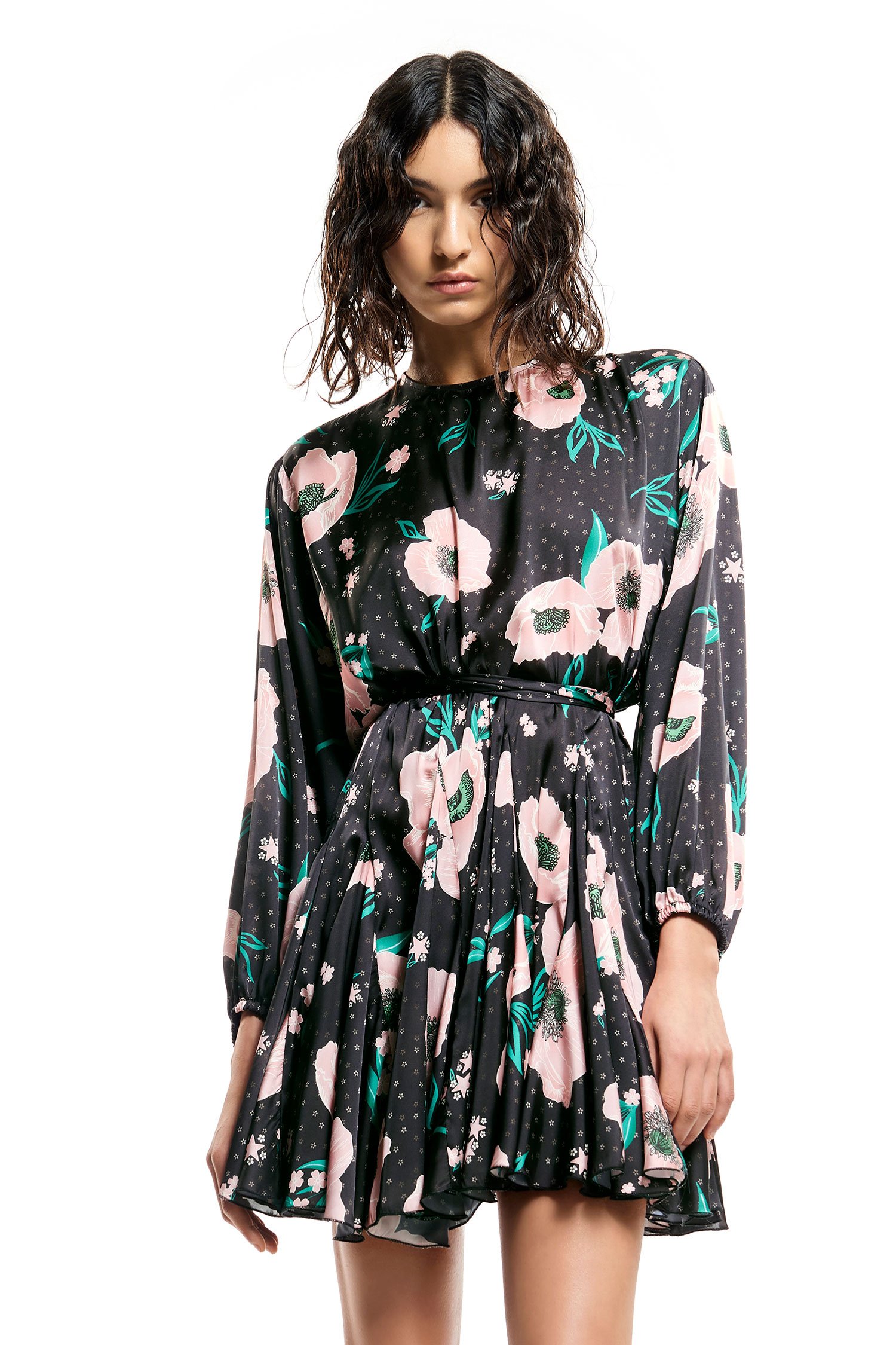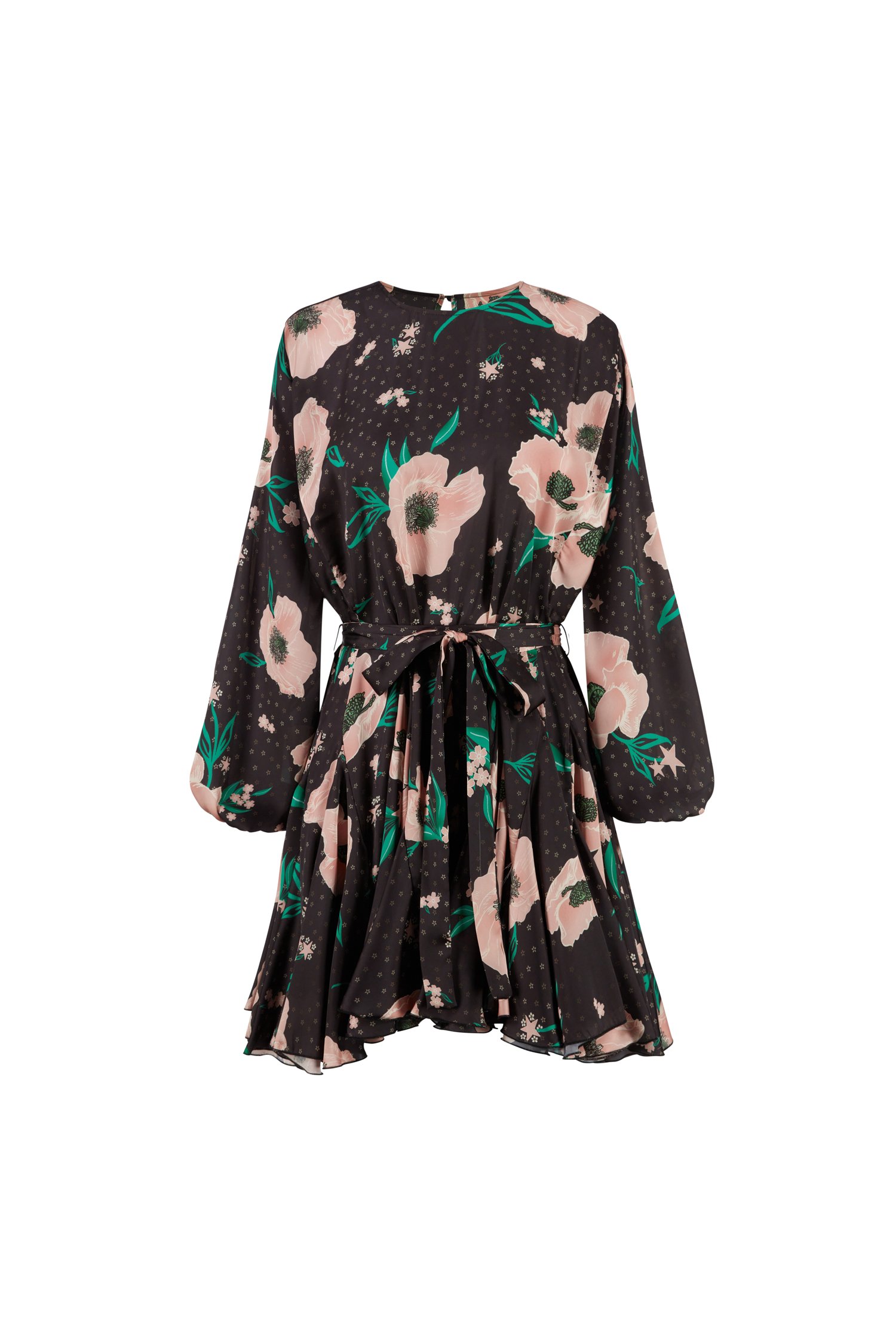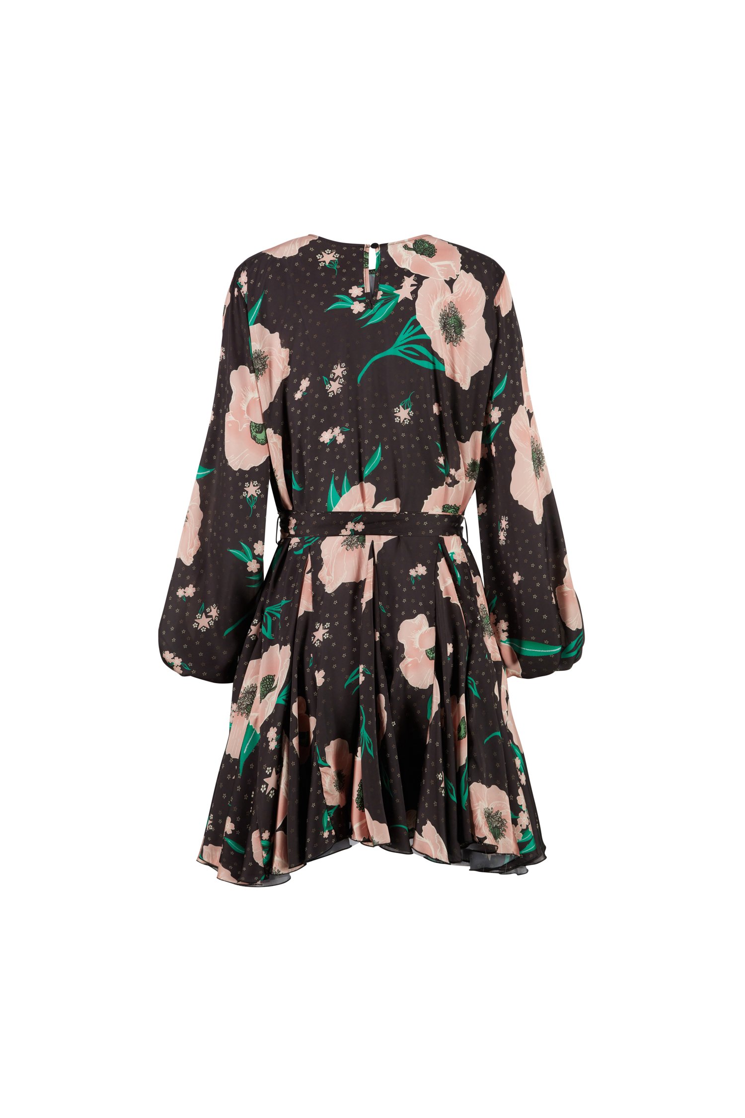 Vestido corto de raso estampado con falda suave y cinturilla.